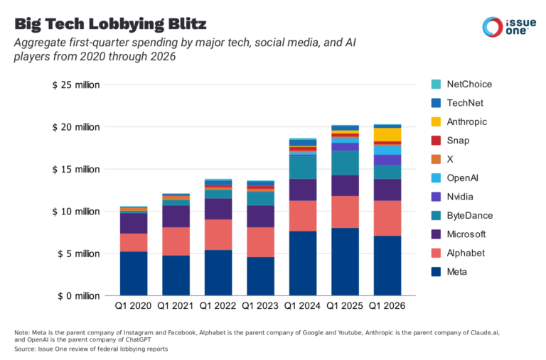 And a new analysis from Issue One puts the lobbying machine in stark relief: just 11 major tech and AI companies poured $20 million into federal lobbying in the first quarter of 2026 alone – more than $200,000 per day, including Sundays and holidays. Six of those companies employed 307 lobbyists in Q1: more than one for every two members of Congress. On top of that, they funneled more than $190 million into super PACs for the midterms. The industry has invested big in early midterm contests and is openly gearing up to spend even more to, as the report puts it, "discipline candidates who might restrain their power."