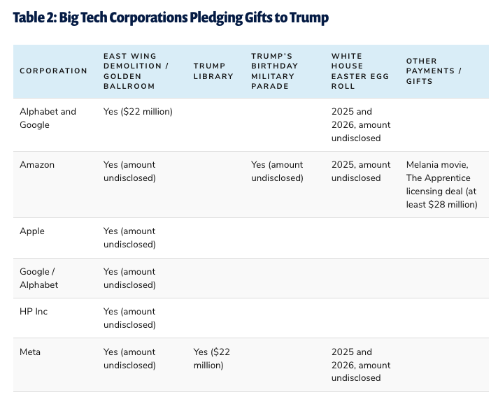💸 BIG TECH’S POLITICAL BET: A new Public Citizen report catalogs, company by company, how the biggest names in Big Tech have sold the American people up the river by cozying up to the Trump administration over the past year. This report is THE anthology, pulling together policy reversals, love-letter quotes from Big Tech CEOs, combined political donations worth $653 million, donations to Trump pet projects, and dropped equity and inclusion commitments.
