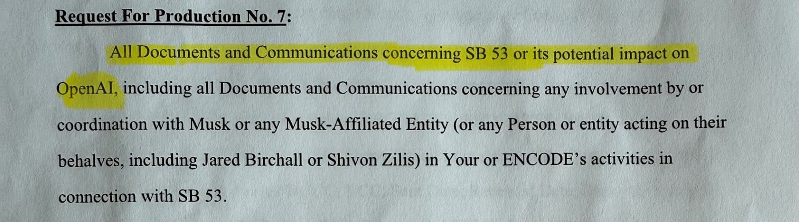 OpenAI’s excuse was that the subpoena was part of its lawsuit against Elon Musk. But it explicitly sought “all communications concerning SB 53 or its potential impact on OpenAI.” That’s not just bullying; it’s an unprecedented abuse of process.