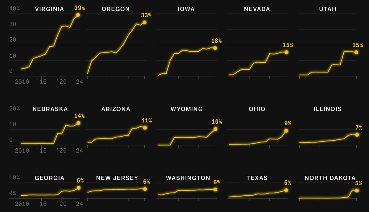 In Virginia, Dominion Energy projects demand will rise more than 75% by 2039 with data centers, compared to just 10% without them. The company has asked regulators to raise rates by about $20 a month for the average household.