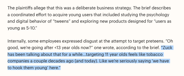 Expect more details on Meta, Google, TikTok, and Snap's internal processes and policies, and stay tuned for courtroom testimony from Big Tech CEOs like Mark Zuckerberg, Adam Mosseri, and Evan Spiegel. This is the Big Tobacco case of our generation. Don't take our word for it. Take Meta's.