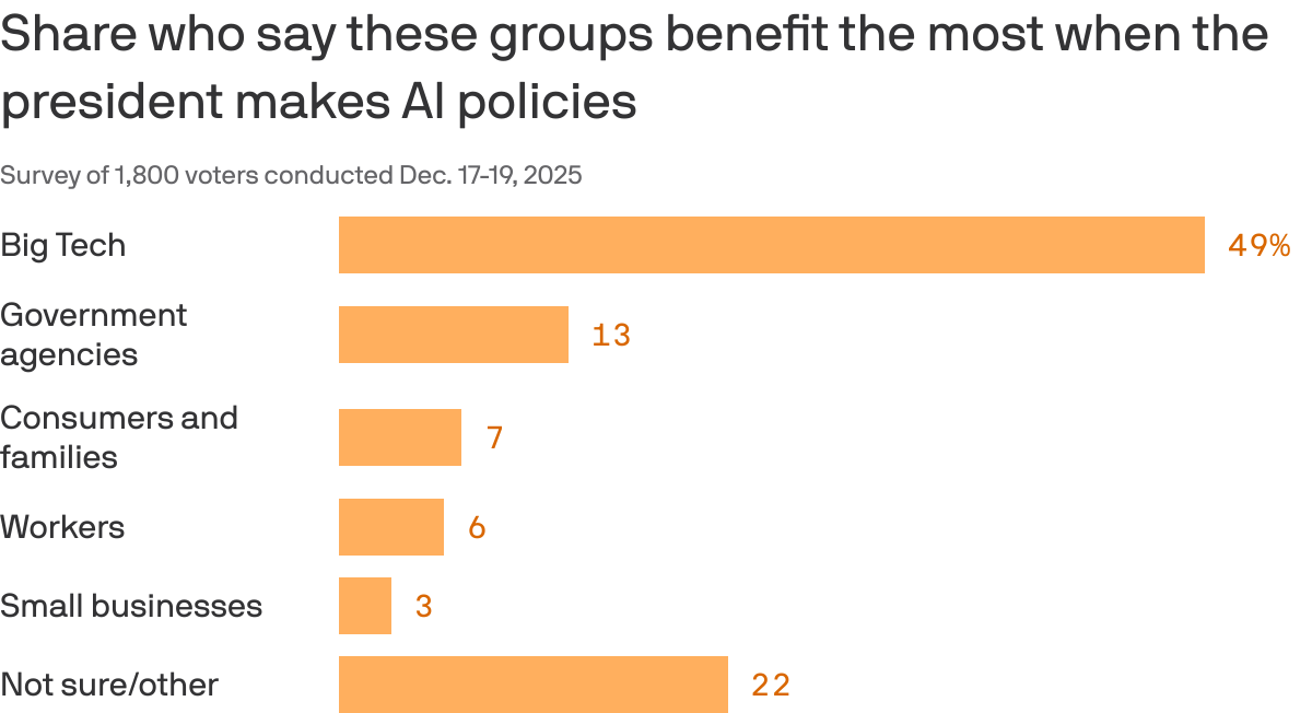 - Nearly half of people (49%) believe Big Tech benefits most when the Trump Administration makes AI policy decisions, and only 13% believe the Trump Administration’s decisions benefit families or workers.